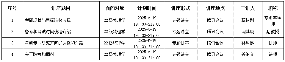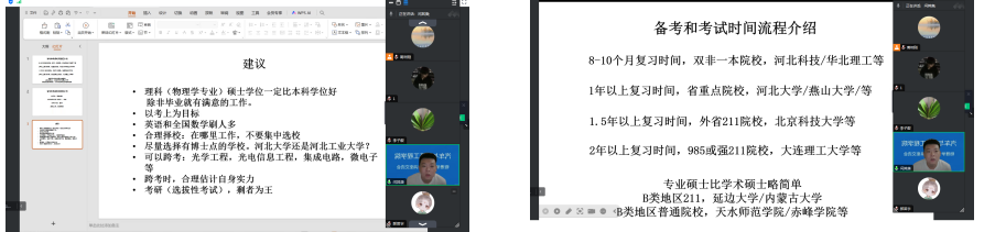 助力物理学专业学生成功考研,集中答疑23级、22级物理学专业学生考研过程中遇到的相关问题,汽车与电子工程学院物理教研室组织本教研室四位博士生教师于腾讯会议线上形式进行了一次全方位的考研讲座。讲座内容涉及到:考研现状与目标院校选择、备考和考试时间流程、介绍考研专业研究方向的选择和介绍、关于跨考和调剂几个方面。
