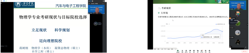 蒋树刚老师结合自己的考研、读研、读博经历探讨了考研现状与目标院校选择问题,围绕“立足现状、科学规划、迈向理想院校”主题,探讨了物理学专业考研的现状与目标院校选择的策略。1.立足现状,认清现实,坚定考研信心。2.清晰认识当前的考研形势,掌握科学规划的方法,明确方向。3.提前了解研究方向与就业前景,合理确定报考院校及专业。