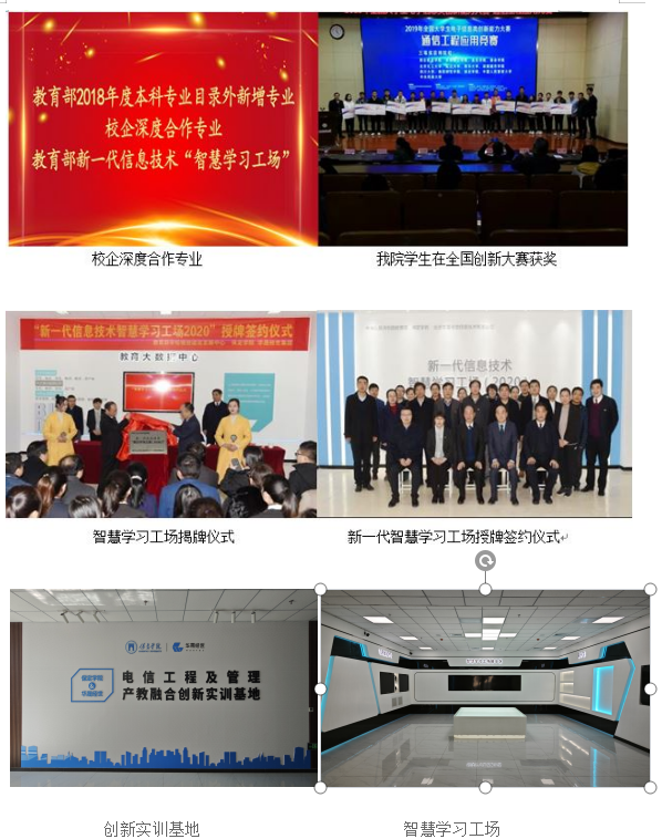 北京华晟经世信息技术有限公司是支持本科院校向应用型转变的“教育部-中兴通讯ICT产教融合创新基地”,与教育部学校规划建设发展中心、中兴通讯签订《创新互联网+教育生态项目》战略合作协议,启动创新互联网+教育生态项目,与我院共建《新一代信息技术“智慧学习工场”》项目。河北荣毅通讯有限公司是一家专业从事信息产品研发、生产的高新技术企业。